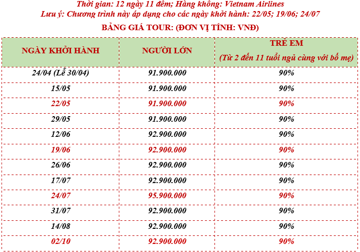 ● Giá áp dụng theo tỷ giá EURO khoảng 28.500 vnđ/ 1 EUR. Nếu tỷ giá có biến động, phía công ty du lịch sẽ điều chỉnh tỷ giá giảm hoặc tăng theo tình hình thực tế.