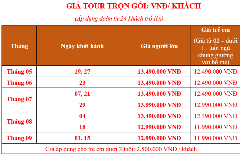 - Giá tour có thể thay đổi theo biến động phụ phí nhiên liệu/giá dầu thế giới tại thời điểm xuất vé dẫn đến hàng không tăng giá và phí visa thay đổi.