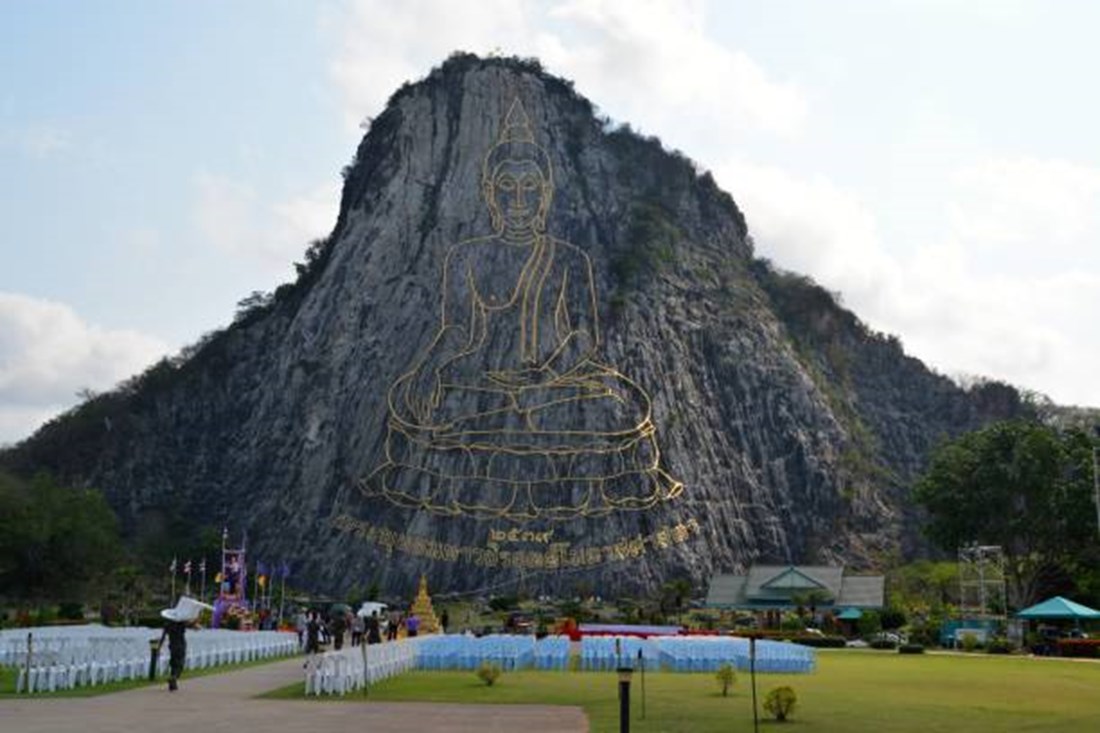 Tiếp tục tham quan “Trân Bảo Phật Sơn” hay còn gọi là KHAO CHEE CHAN, nơi được tạo nên nhân dịp kỷ niệm 50 năm đăng cơ của nhà vua Thái Lan. Là một ngọn núi đẹp nổi tiếng ở tỉnh Chon Buri, Thái Lan chỉ khoảng 15 km, Nổi bật giữa thiên nhiên hùng vĩ và vẻ đẹp hoang sơ của thiên nhiên là bức tượng nổi Thích Ca Mâu Ni Phật đang cân đà được trên đỉnh cao, Bức tượng cao đến hơn 100 mét, rộng khoảng 70 mét, được nổi tiếng bằng vàng ròng 24 cara, được tiến hành vào năm 1996 nhân Quốc vương Rama IX trị vì vương quốc Thái Lan được 50 năm.