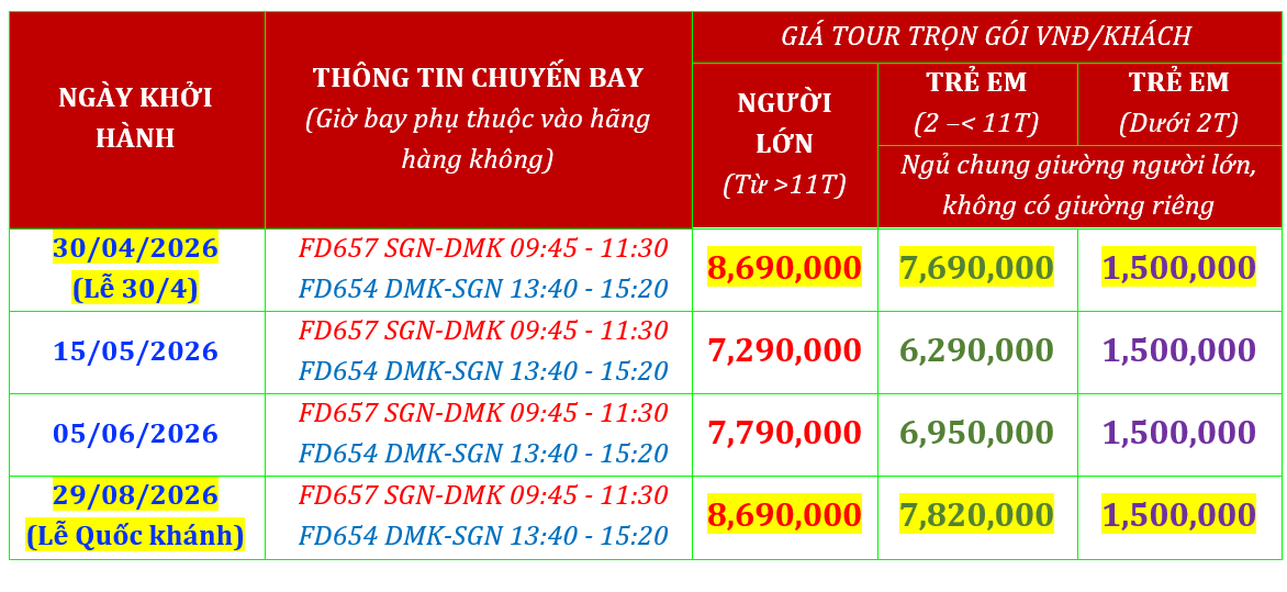 GIÁ TOUR TRỌN GÓI BAO GỒM: