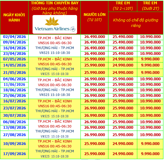 Lúc 22h00 theo ngày hẹn Đoàn, HDV đón đoàn tại sân bay Tân Sơn Nhất là thủ tục đáp chuyến bay đi Bắc Kinh trên chuyến bay VN516 lúc 00:45 – 06:30.