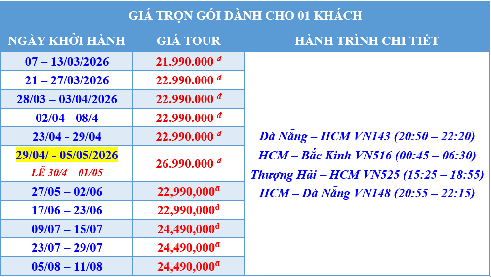 - Vé máy bay chặng: Đà Nẵng - HCM – Bắc Kinh //Thượng Hải – HCM – Đà Nẵng (Vé đoàn) bao gồm HLKG 23kg/kiện + HLKG 10kg/kiện