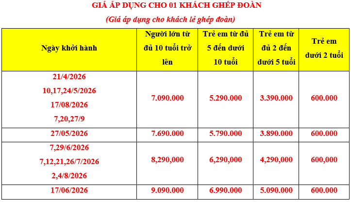 Giá tour trẻ em: Áp dụng theo bảng giá. Độ tuổi sẽ được tính từ ngày sinh đến ngày khởi hành.