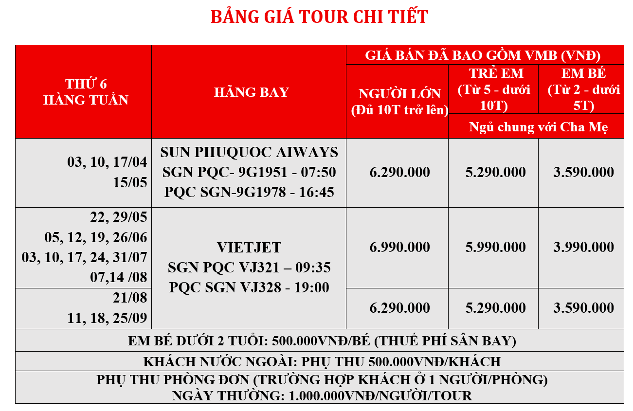 Dưới 05 tuổi: Miễn phí tour (chi phí phát sinh trên tour gia đình tự chi trả). Hai người lớn chỉ được kèm theo 01 trẻ, từ trẻ thứ hai tính theo gói trẻ em 5t trở lên.